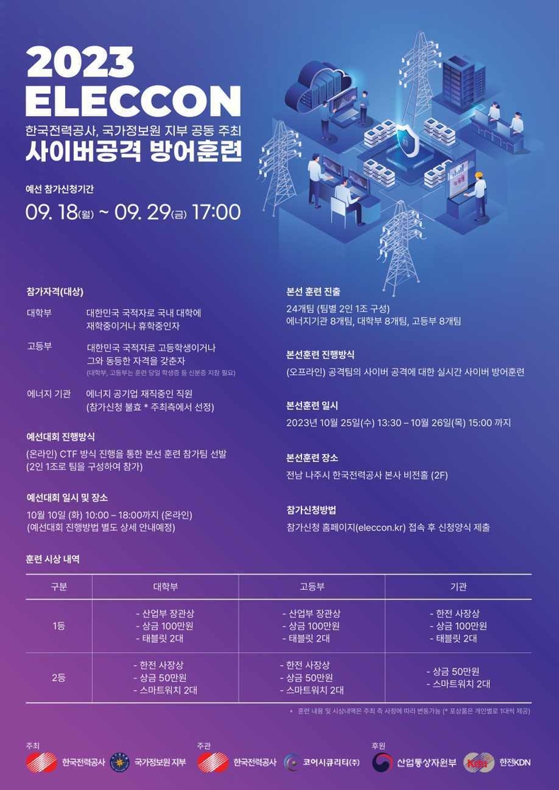 □ 한국전력(사장 직무대행 이정복)은 9월 18일부터 29일까지 「실전형 사이버공격 방어훈련」(ELECCON 2023, 이하 ‘일렉콘’) 참가자를 온라인으로 모집할 예정임.