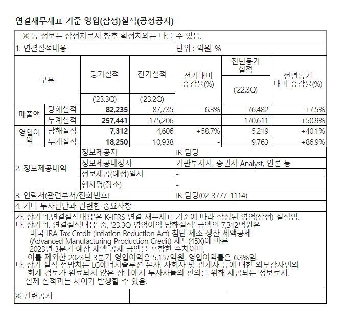 [ 타임즈 - 김시창 기자 ] LG에너지솔루션이 2023년 3분기 잠정 실적을 발표했다.