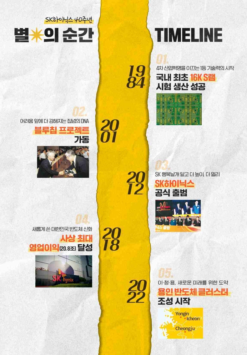 [ 타임즈 - 김시창 기자 ] SK하이닉스가 창립 40주년을 맞았다. 반도체 산업 불모지였던 대한민국에서 담대한 도전정신으로 사업을 시작한 1983년부터, 세계 최초와 최고의 기록을 써 내려가며 글로벌 메모리 반도체 시장을 이끌고 있는 2023년까지… SK하이닉스가 끊임없이 도전하며 혁신을 만들어 온 시간 속, 가장 빛났던 ‘별의 순간*’은 언제일까?