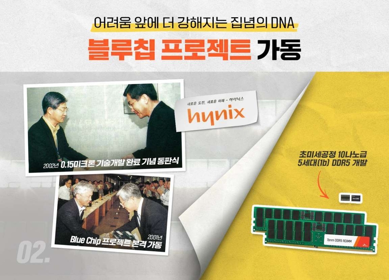 2000년 밀레니엄이 바뀌었다. 하지만 회사는 새천년에 대한 기대에 들뜰 겨를이 없었다. IMF 외환위기로 발행했던 회사채들의 만기가 줄줄이 돌아오는 시점이었다. 이미 LG반도체와의 합병으로 부채가 급증한 상황. 설상가상으로 닷컴 버블 붕괴로 PC 판매가 급감했고, D램 가격도 바닥을 모르고 추락하고 있었다. 극심한 자금난에 모두가 ‘해외 매각 외에는 살 길이 없다’며 고개를 저었다. 하지만 이대로 물러설 수는 없었다. 2001년 대대적인 구조조정 단행과 함께 사명을 ‘하이닉스반도체’로 변경했다. 그리고 회사의 명운을 건, 일명 ‘블루칩(Blue Chip) 프로젝트’를 가동했다.