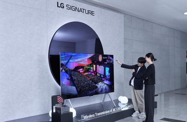 12일 시상식이 개최된 부산 ‘KNN시어터’ 로비에서는 LG전자의 10년 올레드 기술력을 상징하는 LG 시그니처 올레드 M(모델명: 97M3)이 방문객들의 눈길을 끌었다. 이 제품은 현존 최대 크기인 97형 올레드 TV에 세계 최초로 4K 해상도·120Hz 주사율 규격의 영상을 전송하는 무선 솔루션을 탑재했다.