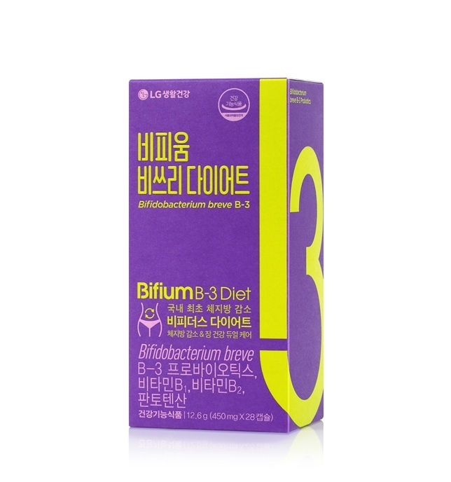 비피움 비쓰리 다이어트는 식품의약품안전처로부터 국내 최초로 체지방 감소 기능성을 인정 받은 국내 유일한 원료인 ‘비피도박테리움 브레브 B-3(Bifidobacterium Breve B-3, 비피더스 비쓰리)’로 처방해 체지방 감소와 장 건강에 도움을 준다. 해당 성분은 7가지 인체적용시험*에서 체중 감소, 체지방량 감소 등이 확인됐다.