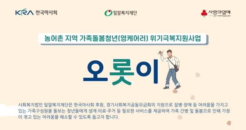밀알복지재단 정형석 상임대표는 “어린 시절 시작되어 청소년기를 거쳐 장기화되는 돌봄수고는 발달과정에 있는 아동·청소년의 성장과 발달에 큰 부정적 영향을 미친다. 이번 한국마사회의 지원을 통해 가족돌봄 청년들의 어려운 문제들을 해결할 수 있길 바란다”고 전했다.