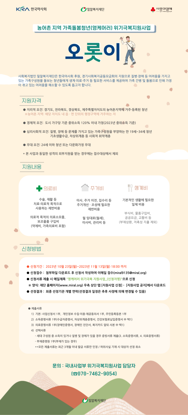 본 사업의 신청기간은 10월 23일부터 11월 13일이며, 밀알복지재단 홈페이지에서 지원가능하다. 세부적인 지원자격과 신청방법 역시 홈페이지에서 확인 가능하다.