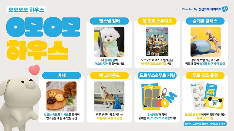 오모오모 컨셉의 카페에서는 오모오모 캐릭터 쿠키와 다양한 음료를 제공하고, 1층 포토부스에서는 견생네컷 및 키링 제작을 체험할 수 있다. 한편 '삼성화재 펫 보험 가입자'에게는 펫 슬개골 마사지 클래스 무료 참여 혜택을 제공한다.