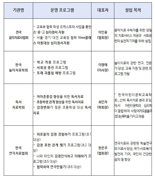 이번에 업무협약을 맺는 4개 민간단체는 늘봄학교에 음악, 놀이, 독서, 연극 등 다양한 프로그램과 전문강사를 제공하여 초등학생들의 심리·정서 발달 및 회복을 지원한다.