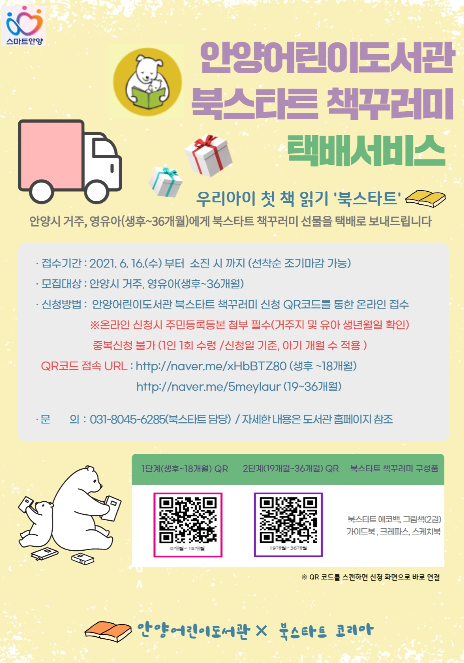 해당 서비스 신청은 6월 16일부터 안양시립도서관 홈페이지에 게시된 책꾸러미 신청 QR코드를 통해 접수 받는다. QR코드로 접속한 링크에서 신청서를 작성하고 증빙서류(주민등록등본)를 첨부하면 도서관에서 확인 후 책꾸러미를 발송해준다.