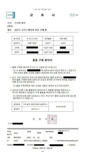 군포시에 따르면 지난 13일 군포시 공무원을 사칭하여 관용차 관련 ‘물품구매 확약서’ 허위 공문을 받았다는 관내 기업체 대표의 제보를 받고 확인한 결과 공문서를 위조한 것으로 확인됐다.