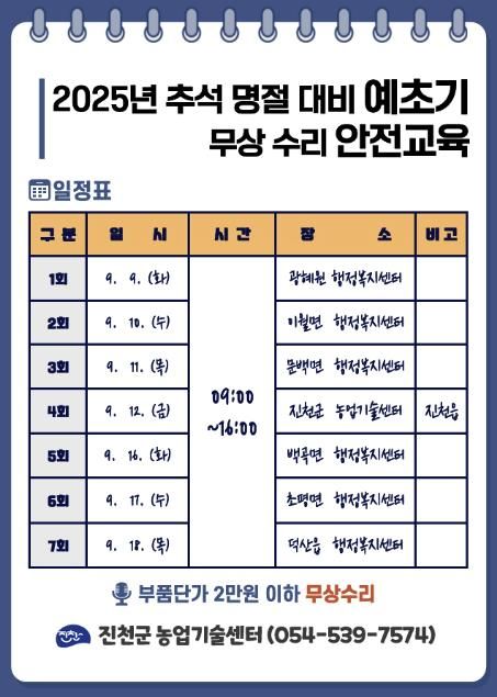 교육은 9월 9일 광혜원을 시작으로 18일(목)까지 관내 읍·면 행정복지센터와 농업기술센터에서 순차적으로 진행된다.