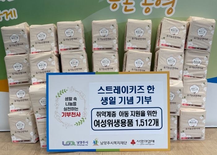 [ 타임즈 - 김시창 기자 ] 남양주시는 16일 남양주시복지재단이 스트레이키즈 멤버 ‘한’의 팬으로부터 여성용품 1,512개를 기부받았다고 밝혔다. 이번 기부는 ‘한’의 생일(9월 14일)을 기념해 추진됐다.