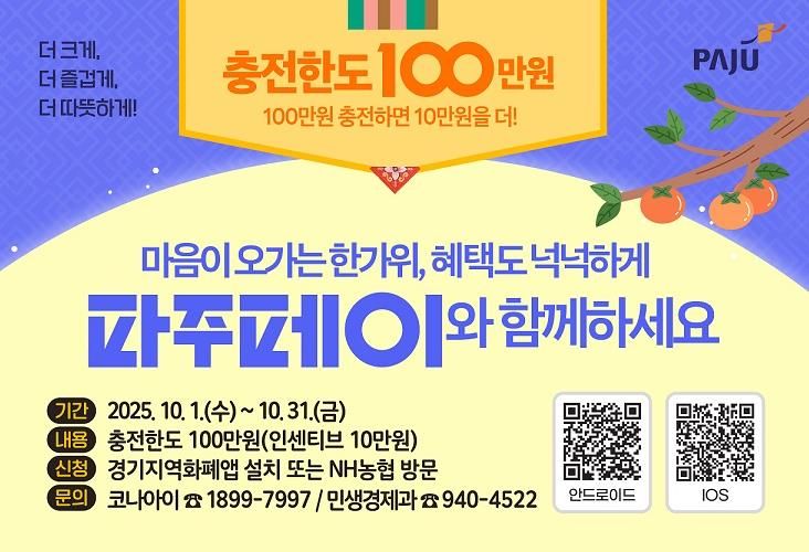 [ 타임즈 - 김시창 기자 ] 파주시는 추석을 맞이해 시민의 생활비 부담을 줄이고 지역경제에 활력을 불어넣기 위해 10월 1일부터 31일까지 한 달간 파주페이 충전 한도를 최대 100만 원까지 상향한다.
