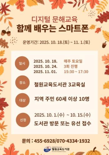 [ 타임즈 - 김시창 기자 ] 철원교육도서관은 지역 고령층의 디지털 활용 능력 향상과 격차 해소를 위해 오는 10월 18일부터 11월 1일까지 매주 토요일, 총 3회에 걸쳐 ‘함께 배우는 스마트폰’ 디지털 문해교육을 운영한다.