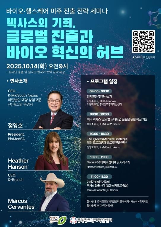 [ 타임즈 - 김시창 기자 ] 청주시와 충북창조경제혁신센터는 바이오분야 창업기업의 글로벌 진출을 지원하기 위해 14일 온라인 세미나 ‘텍사스의 기회 : 글로벌 진출과 바이오 혁신의 허브’를 개최했다.