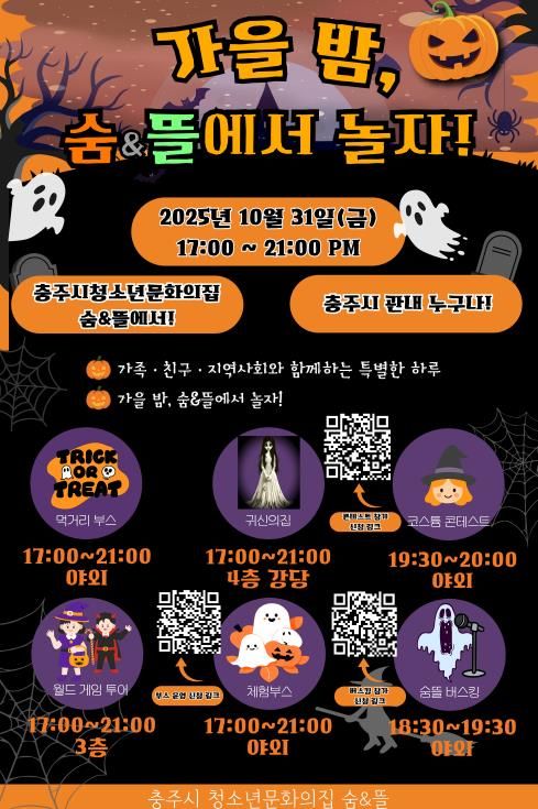 [ 타임즈 - 김시창 기자 ] 충주시청소년문화의집 숨·뜰에서는 10월 31일 오후 5시부터 9시까지 ‘가을밤, 숨뜰에서 놀자!’ 행사를 진행한다고 밝혔다.