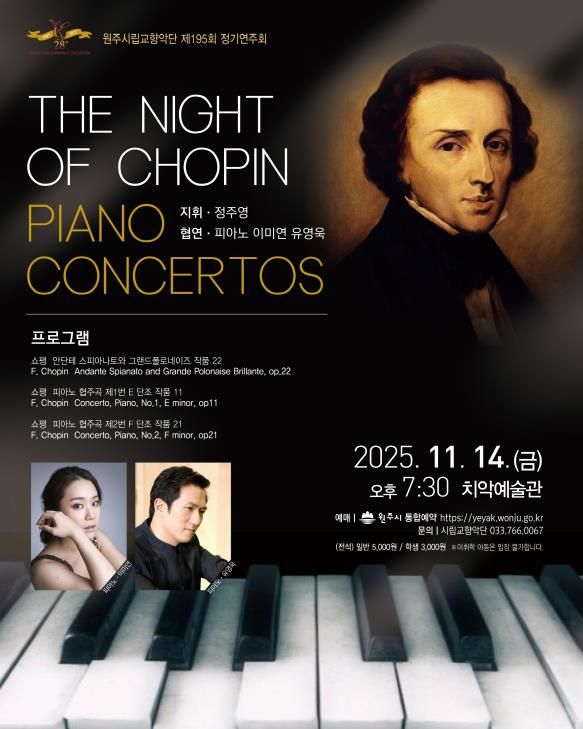 [ 타임즈 - 김시창 기자 ] 원주시립교향악단은 오는 14일 오후 7시 30분, 치악예술관에서 제195회 정기연주회 ‘The Night of CHOPIN’을 개최한다.
