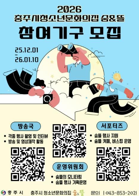 [ 타임즈 - 김시창 기자 ] 충주시청소년문화의집 숨&뜰은 2026년을 함께할 청소년 참여기구 신규부원을 모집한다고 4일 밝혔다.