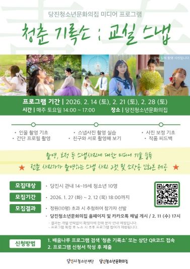 [ 타임즈 - 김시창 기자 ] (재)당진시청소년재단 당진청소년문화의집(관장 유수민)은 오는 2월 14일부터 28일까지 매주 토요일, 14시부터 17시까지 관내 14~19세 청소년을 대상으로 미디어 프로그램 [청춘 기록소 : 교실 스냅]을 운영할 예정이다.