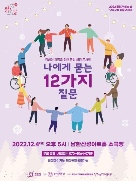 문화가 있는 날 ‘나에게 묻는 12가지 질문’ 공연은 12월 4일 오후 5시부터 남한산성아트홀 소극장에서 진행되며 사전접수 또는 현장 접수를 통해 무료로 관람할 수 있다.
