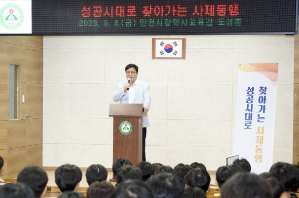 도성훈 교육감은 이 자리에서 ▶코로나 대응과 미래교육 기반 구축 ▶세계교육의 흐름 ▶인천교육의 미래와 방향을 주제로 특강을 진행하고 학생들과 의견을 나눴다.