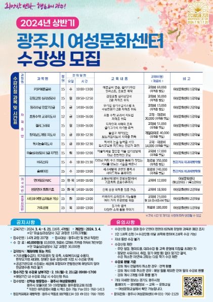 [ 타임즈 - 김시창 기자 ] 광주시 여성문화센터는 오는 19일부터 23일까지 ‘2024년 상반기 여성문화센터 프로그램’ 수강생을 모집한다고 14일 밝혔다.