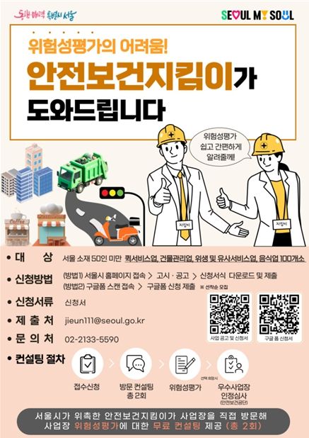 위험성평가 무료 컨설팅은 서울 소재의 50인 미만 ▴퀵서비스업 ▴건물관리업 ▴위생및유사서비스업 ▴음식업 사업장이면 신청할 수 있다.