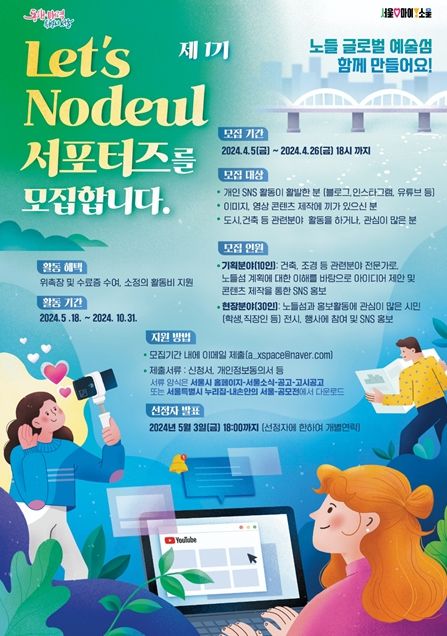서울시는 ‘노들 글로벌 예술섬 조성사업’의 추진과정을 시민과 공유하고 새로운 노들섬에 대한 홍보 및 시민 의견수렴 등을 통한 공감대 형성을 위해 제1기 ‘Let’s Nodeul 서포터즈’를 4월 5일부터 3주간 모집한다.