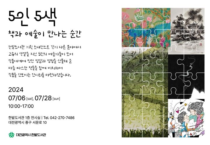 [ 타임즈 - 김시창 기자 ] 대전시 한밭도서관은 6일부터 28일까지 본관 1층 전시실에서 ‘5인 5색: 책과 예술이 만나는 순간’ 전시를 개최한다.