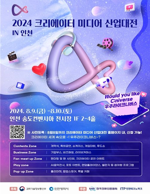 참관객 사전 등록 및 자세한 내용은 ‘2024 크리에이터 미디어 산업대전 in 인천 홈페이지에서 확인 할 수 있으며, SOOP(아프리카TV) ‘크미대’ 채널 시청을 통해 온라인으로도 참여할 수 있다.