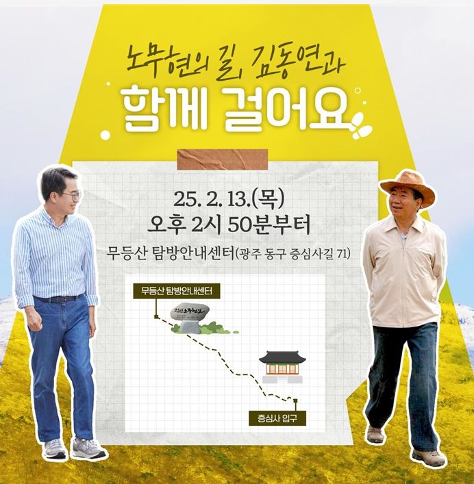 김동연 지사는 노무현재단 광주지역위원회 및 광주시민회 관계자 100여명과 함께 광주시 동구 중심사길에 있는 노무현 표지석을 시작으로 증심교, 의재미술관, 증심사 입구까지 1km 구간을 약 1시간 동안 걸을 예정이다.