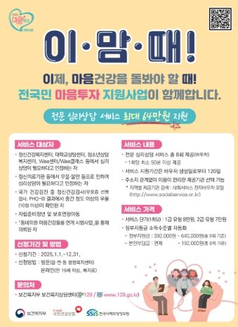 전국민 마음투자 지원사업은 국민 정신건강 돌봄을 위해 2024년 7월부터 우울, 불안 등 정서적 어려움이 있는 국민 대상으로 대화 기반의 전문 심리상담 서비스를 지원하는 사업이다.