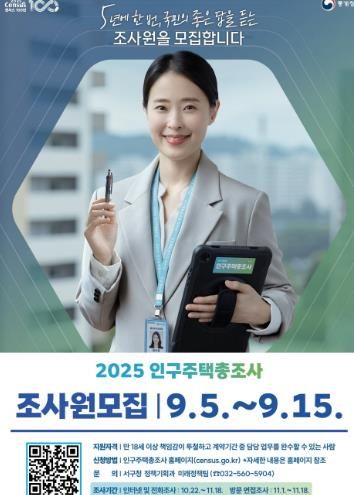[ 타임즈 - 김시창 기자 ] 인천 서구는'2025 인구주택총조사'를 함께 이끌어갈 조사원을 모집한다고 5일 밝혔다.