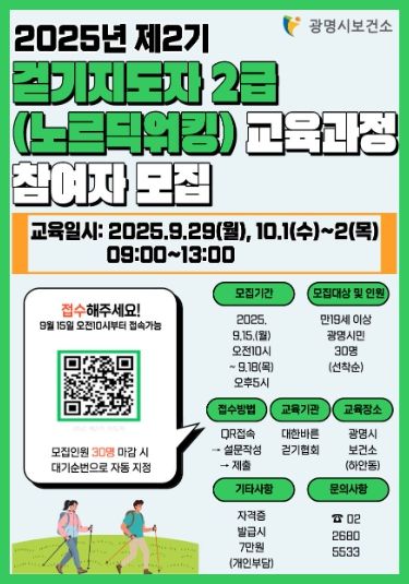 [ 타임즈 - 김시창 기자 ] 광명시 보건소는 ‘2025년 제2기 걷기지도자 2급(노르딕 워킹) 양성 교육 과정’ 참여자를 모집한다.