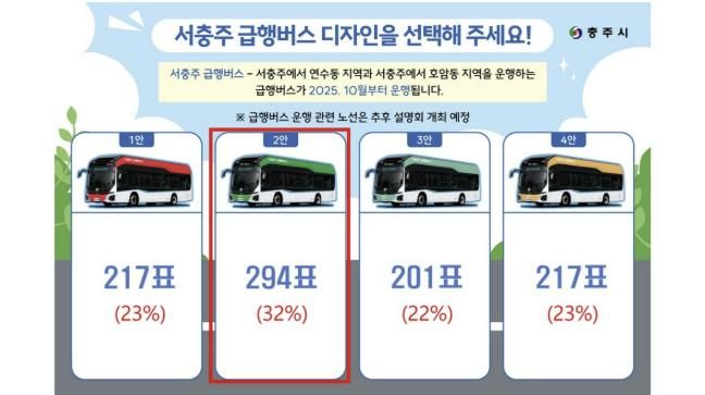시는 지난 8월 19일부터 24일까지 서충주 도서관 등 3개소에서 급행버스 디자인 시민 선호도 조사를 실시해 디자인을 최종 결정했다.