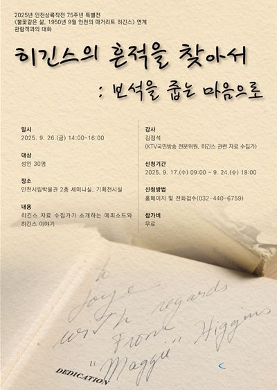 [ 타임즈 - 김시창 기자 ] 인천광역시 시립박물관은 9월 26일‘불꽃같은 삶: 1950년 9월 인천의 마거리트 히긴스’ 특별전과 연계해 ‘관람객과의 대화’ 행사를 개최한다고 밝혔다.