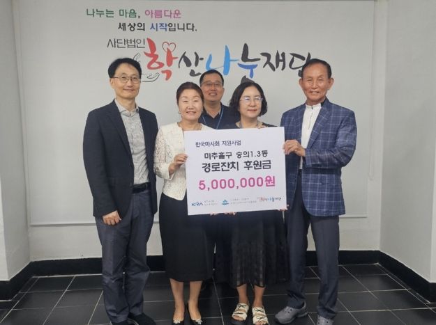 [ 타임즈 - 김시창 기자 ] 미추홀구 숭의1·3동 지역사회보장협의체(위원장 민명숙)는 한국마사회 인천미추홀지사(지사장 조영진)의 공모사업에 ‘숭의1·3동 경로잔치’가 선정돼 지난 18일 기부금 500만 원을 전달받았다.