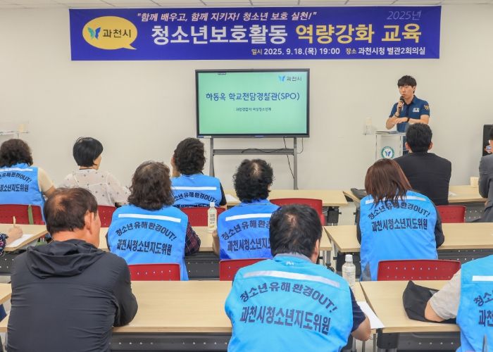 [ 타임즈 - 김시창 기자 ] 과천시는 지난 18일 시청 별관2 회의실에서 청소년지도위원, 유해환경감시단, 문원초 아버지회 등 청소년 선도·보호 활동 단체 40여 명을 대상으로 ‘함께 배우고, 함께 지키자! 청소년 보호실천!’이라는 주제로 역량 강화 교육을 했다.