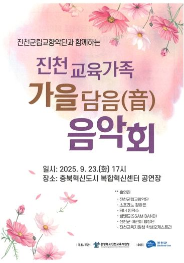 [ 타임즈 - 김시창 기자 ] 충청북도진천교육지원청은 오는 9월 23일 17시,충북혁신도시 복합혁신센터에서 '2025. 진천교육가족 가을담음(音) 음악회'를 개최한다.