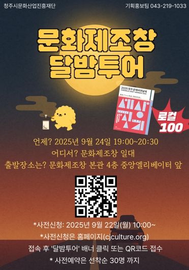 [ 타임즈 - 김시창 기자 ] 청주시문화산업진흥재단이 22일 오전 10시부터 ‘문화제조창 달밤투어’ 9월의 두 번째 투어객 모집에 들어간다.