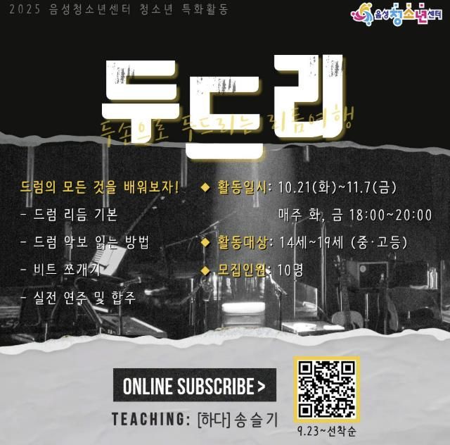 이번 프로그램은 타악기 연주(드럼)를 통해 리듬감을 익히고, 청소년들에게 새로운 흥미와 동기 부여를 제공하기 위해 기획됐다.