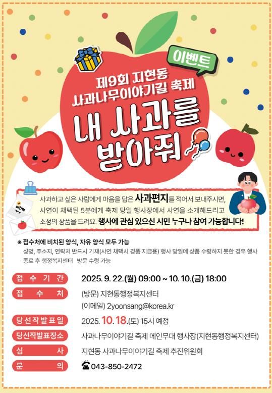 한편, 올해로 9회째를 맞이하는 지현동 사과나무이야기길 축제는 10월 18일 오후 1시부터 지현동행정복지센터 일원에서 개최하며, 아기자기한 지현동의 사과나무이야기길 명소에서 인증 사진을 찍으면 기념품을 주는 포토 존 이벤트 등 다양한 프로그램을 선보일 예정이다.