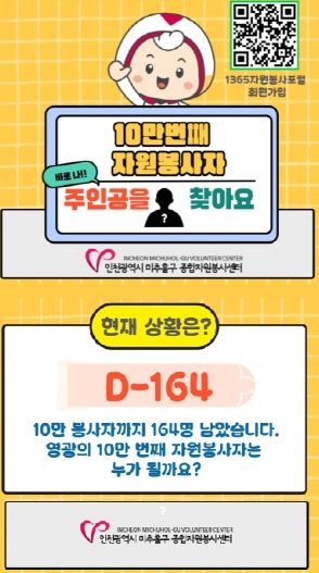 이번 이벤트는 미추홀구 소속 1365 자원봉사포털 신규 회원 가입자를 대상으로 하며, 누적 봉사자 수가 10만 명에 도달하는 순간 선정된 봉사자를 기념하고 축하하기 위해 마련됐다.