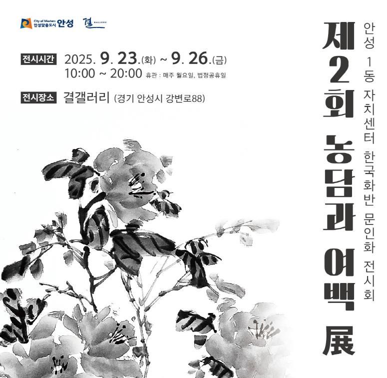 [ 타임즈 - 김시창 기자 ] 안성1동 자치센터 한국화반은 오는 9월 23일부터 9월 26일까지 안성천 작은미술관 결갤러리에서 ‘제2회 농담과 여백전’을 개최한다.