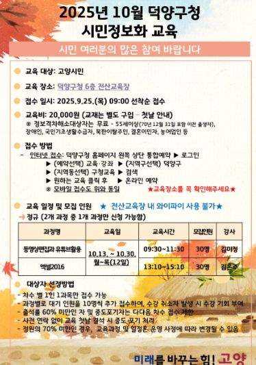 신청은 온라인으로만 가능하며, 각 과정별 선착순 30명을 모집한다. 신청은 덕양구청 누리집 ‘생활정보-교육-정보화교육’또는 ‘통합예약-교육·강좌-정보화교육’에서 할 수 있다.