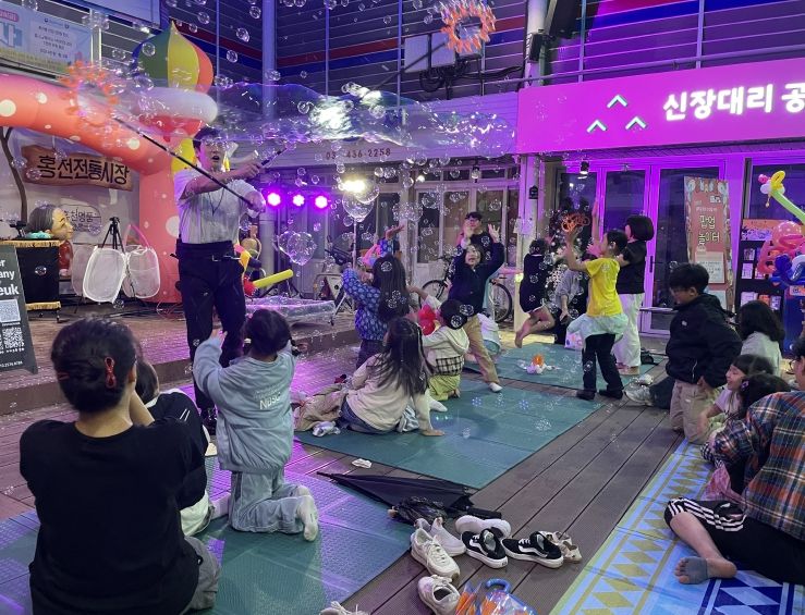[ 타임즈 - 김시창 기자 ] 홍천군은 9월 19일 오후 6시 30분부터 7시 30분까지, 우천으로 인해 당초 예정된 꽃뫼공원에서 홍천 전통시장 중앙광장으로 장소를 변경하여 ‘팝업 놀이터 버블쇼’를 개최했다.