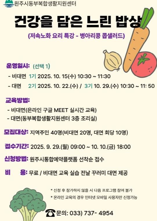 모집 인원은 지역 주민 40명으로, 비대면 교육은 20명, 대면 교육은 기수당 10명씩 모집한다. 참여 신청은 9월 29일 오전 9시부터 원주시통합예약플랫폼에서 선착순으로 접수한다.