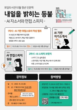 [ 타임즈 - 김시창 기자 ] 김포시 모담도서관에서 생성형 인공지능을 활용해 자기소개서 및 면접 스피치를 준비해볼 수 있는 청년 대상 프로그램을 10월 25일 오전 11시부터 총 2차시에 걸쳐 운영한다.