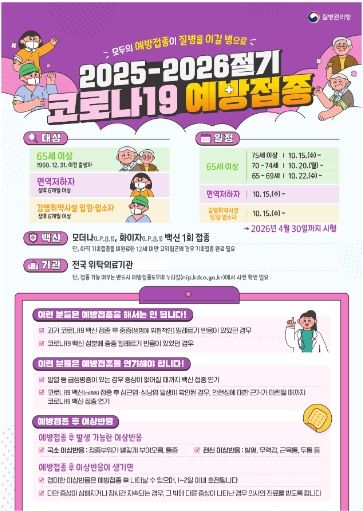 접종 기간은 오는 10월 15일부터이며, 연령대별로 75세 이상 어르신부터 시작하고 ▲70~74세는 10월 20일부터 ▲65~69세는 10월 22일부터 접종을 시작한다. 같은 날에 인플루엔자 백신도 동시 접종할 수 있다.