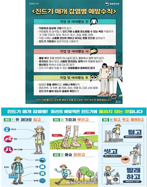 추석은 야외활동이 많은 시기로 진드기의 활동 시기와 겹쳐 감염 위험이 커지는 만큼, 야외에서는 긴소매와 긴 바지를 착용해 피부 노출을 줄이고 기피제를 사용하며, 벌초·성묘 후에는 샤워와 의류 세탁을 통해 몸에 붙은 진드기를 제거하는 등 예방수칙을 철저히 지켜야 한다.