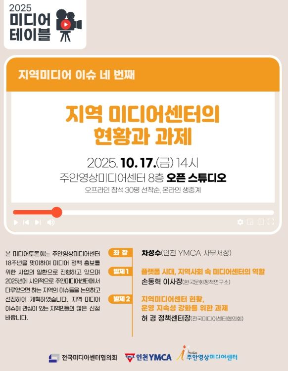 [ 타임즈 - 김시창 기자 ] 인천 미추홀구 주안영상미디어센터는 오는 10월 17일 오후 2시 센터 오픈 스튜디오에서 ‘미디어 테이블: 지역 미디어센터의 현황과 과제’ 토론회를 개최한다.