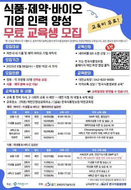 교육 과정은 ▲공통 이론 교육(제천, 10월 20일·27일) ▲제약·바이오 분야 미생물 및 HPLC·밸리데이션 실습반(대전, 10월 28일~29일) ▲식품 분야 미생물 및 HPLC 실습반(대전, 11월 5일~6일)으로 나눠 진행된다.